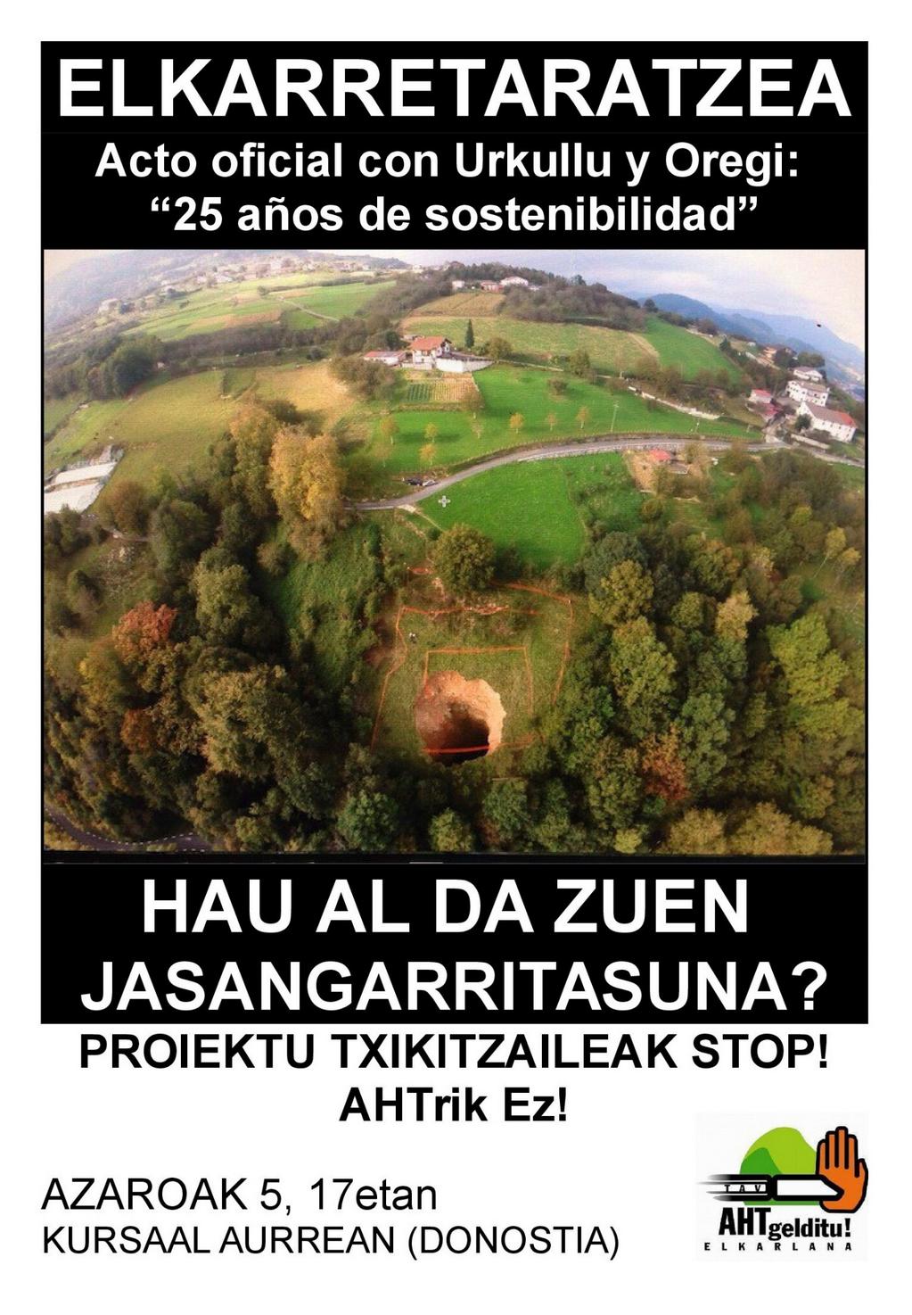 Concentración de denuncia del TAV ante el acto oficial del Gobierno Vasco bajo el lema “25 años de sostenibilidad”, organizado este miércoles 5 de noviembre en el Kursaal, Donostia, a las 17:30 y que contará con la presencia de Iñigo Urkullu y Ana Oregi.