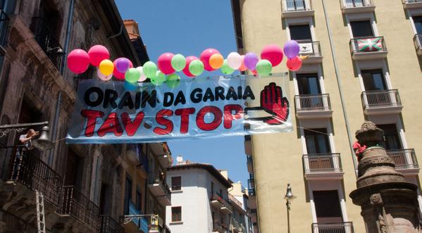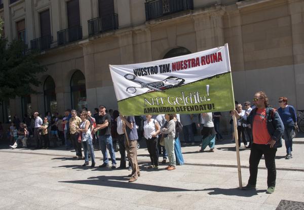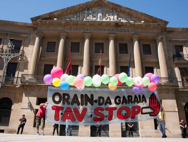 Miembros de AHT Gelditu! (coordinadora contra el TAV), Sustrai Erakuntza, Ekologistak Martxan y vecinas y vecinos de zonas afectadas por las obras del TAV en Navarra, se concentraron el pasado sábado ante el Palacio de la Diputación Foral al objeto de subrayar el importante cuestionamiento social del TAV (también llamado TAP, Tren de Altas Prestaciones) en Navarra y remarcar que ahora es el momento de paralizar dichas obras por constituir un gran derroche económico, una gran hipoteca de recursos públicos y una más que notable destrucción del patrimonio natural en Navarra.
