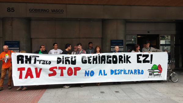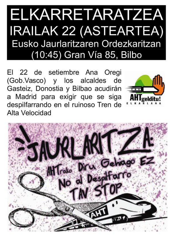 Hoy martes 22 de setiembre Ana Oregi (consejera de Medio Ambiente del Gobierno Vasco) y los alcaldes de Bilbao, Gasteiz y Donostia han acudido a Madrid para mantener un encuentro informativo sobre el TAV con la ministra de Fomento, Ana Pastor. Para denunciar el contínuo despilfarro económico y la inviabilidad social del TAV, AHT Gelditu! Elkarlana, ha realizado una concentración en la delegación del Gobierno Vasco en Bilbao (Gran via, 85).