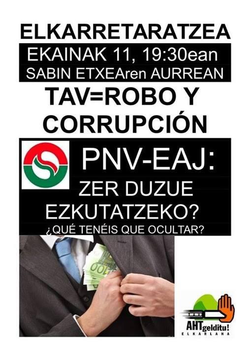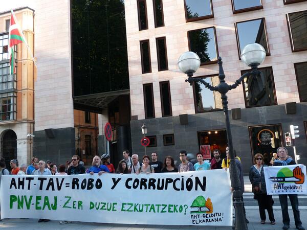 ACTUALIZACIÓN: Decenas de personas han secundado en Bilbo, ante la sede del PNV, la convocatoria de AHT Gelditu! para denunciar el TAV como mejor ejemplo de robo y corrupción. Asi mismo se denuncia el continuo silencio del PNV con el desarrollo del proyecto, ejecutado a espaldas de los ciudadanos.